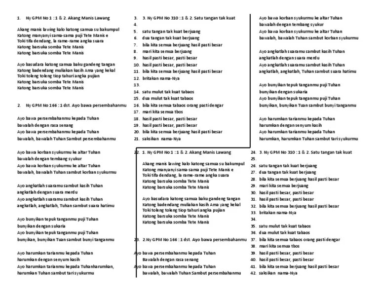 Bawa persembahanmu, bawa dengan suka. Klik di sini untuk mendengarkan musik … do = f 2 ketuk. Rahmat tuhan padamu tidak tertandingi Bawa persembahanmu dalam rumah tuhan dengan rela hatimu, janganlah jemu.